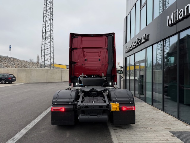 A1Z Přední náprava, prohnuté provedení A2E Zadní náprava 13 t, talířové kolo 440, hypoidní A3D Zadní náprava s neřízeným aktivním mazáním B1B Elektronický brzdový systém s ABS a ASR B1F Vyhřívání sys. rozvodu stlač. vzduchu (APU/EAPU) B1H Ovl. el. jedn. stlač. vzduchu park. brzdy, střed B2A Brzdy kotoučové na přední i zadní nápravě B2X Parkovací brzda elektronická, s funkcí Hold B4A Kondenzační senzor pro stlačený vzduch B4M Vzduchojem ocelový B5J Elektr. a brzdové přípojky pro návěs níže uložené C1W Rozvor 3700 mm C5B Nášlapná plošina nad rámem, částečné pokrytí C5D Schůdky za kabinou, vlevo C6I Čerpadlo posilovače řízení, řízené C7F Zábrana proti podjetí přední (ECE), alu C8C Blatníky zadní pro šířku vozidla 2500 mm C8H Blatníky 3dílné s ochranou proti ostřiku C8I Blatníky vpředu s ochranou proti ostřiku D0S Tlakovzdušná přípojka v kabině řidiče D0U Detektor kouře v kabině D2N Odjištění opěradla sedadla řidiče D2Y Kontrola zapnutí bezpečnostních pásů D4T Záclona napříč kabinou před lůžkem D6M Topení přídavné teplovodní, pro kabinu D8X Podstavec sedadla, snížený o 40 mm DUP0 Konfigurační kód E1U Alternátor LIN 28 V / 150 A E4B Rozhraní pro přenos dat FMS 2.0 (fleet management) E5H Spínač nočního svícení, zelený E5K Spínač MirrorCam, u lůžka E6A Zásuvka pro přívěs 15pólová, 24 V E7F Kabelové dálkové ovládání vzduchového odpružení E8D Konektor USB-C v bočním úložném prostoru, vlevo E8E Konektor USB-C v bočním úložném prostoru, vpravo F0F Boční modul, vozidlo kategorie N3 F1R Kabina L dlouhá F4H Zadní stěna kabiny bez oken F4X Dvířka venkovní schránky, vlevo F4Y Dvířka venkovní schránky, vpravo F6D Čelní sklo determální s pruhem F6I Čelní zrcátko, vyhřívané F6T MirrorCam F7A Nárazník, s plastovými rohy F7C Nárazník vpředu s tažným okem F7T Dveře, prodloužené F7X Vstup do kabiny řidiče levý/pravý, pevný F8B 2 klíče s dálkovým ovladačem F8E Centrální zamykání F8F Centrální zamykání komfortní F8V Světelný senzor F8W Dešťový senzor G0K Jízdní program Economy/Power G0T Predictive Powertrain Control G5A Jednokotoučová spojka G5G Řazení automatizované Mercedes PowerShift 3 G5L PowerShift Advanced H2C Vzdálenost mezi osou ZN a osou točnice +600 mm J0U Remote update of driving assistance map J1M Dig. tachograph, 2nd gen., version 2, ADR J1S Tachograf VDO J2U Navigace On Board J3Z Měření zatížení na nápravách se zobrazením na FSS J6E Multimedia cockpit Interactive 2 J6W Zpětná kamera J7A Truck Data Center 7 J7V Mapové podklady pro Evropu J8G Příprava pro Remote Truck App J8U Příprava pro Truck Data Center 8 K0T Hlavní nádrž, vlevo K5M Uzávěr nádrže uzamykatelný L0A Osvětlení vozidla podle předpisu UN-R 48.06 L1C LED světlomety pro denní svícení L1W Odbočovací světla LED se světelným podpisem L2H Poziční světla, blikající L3F Světlomet pracovní, spodní M0C Spodní kryt proti víření prachu M0E Zvýšení kroutícího momentu na 12. převod. stupeň M0Q Protihlukové zakrytování dle předpisu ECE NGL, úro M3C Motor OM471, R6, 12,8 l, 350 kW (476 k), 2300 Nm M4V Zvýšení točivého momentu v přev. stupních 7-11 M4X Motor v provedení Euro VI, E M5D Motor OM471, 3. generace M5V Motorová brzda, zvýšený výkon M6E Turbodmychadlo, spotřebově optimalizované M6R Air compressor, two-stage, deactivatable M7T Vodní pumpa, řízená M8B Sání vzduchu za kabinou, vně M8N Systém vzduch. filtrů, životnost přes 300 tis. km O0T TruckLive O3K Active Safety OWY Interior measures upgrade Q0W Točnice z výroby Q0Y Úhly náklonů neodpovídající normě DIN ISO 1726 Q4I Výška točnice, H = 150 mm Q6G Točnice bez montážní podložky Q6J Točnice kompaktní, Jost JSK 40K Q6Z Úhelník pro montáž točnice s rastrem děr R1Q Ráfky 9,00 × 22,5 S1D Asistent regulace stability (ESP) S1H Asistent jízdy v pruzích (LDWS) S1L Asistent sledování bdělosti S1O Asistent dopravního značení S1Y Kontrola tlaku v pneumatikách S2D Active Brake Assist 6 S2H Active Sideguard Assist 2 S2L Přední monitorovací asistent (MOIS) S4A Příprava pro alkohol tester s imobilizérem S5A Omezovač rychlosti 90 km/h (ECE) S5Z Tempomat a temposet U2G Výfukový box U3S Elektronická architektura 2. generace V0Q Vozidlo plnící GSR, fáze B V0S Vozidlo třídy N3 V1A Actros V1W Standard V2B Actros – modelová generace 5 V8A Číslo podvozku VIN V9G Technické změny – modelový rok říjen W0J Hmotnostní varianta 18,0 t (7,5/13,0) X1S Štítky a dokumentace česky X2A Typové označení dle hmotnostní varianty X2E Typový štítek, EU X2N Upozornění „L”, zákaz nočních jízd v Rakousku X3W Záruka na hnací řetězec, 3 roky / 450 000 km X3CA0N TRUCKTraining – školení pro 2 řidiče Y1X Lednice výsuvná, pod lůžkem Y4A Zvedák 12 t / 19 t Y4I Klín podkládací Y4R Nástavec pro huštění dvojmontáže, bezdušové pneu Y4Z Tlakovzdušná pistole, s hadicí Z4O Profil nádrže, úzký Z4R Profil nádrže, vysoký Z5E OM 471 Z5X Levostranné řízení Z5Y Vozidlo pro pravostranný provoz