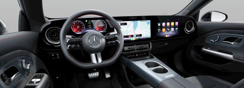 Sada na opravu pneumatik TIREFIT, Akustická výstraha pro okolí, Automatický restart při popojíždění v dopravní zácpě, Asistent přizpůsobení rychlosti, Asistent udržování odstupu DISTRONIC, Aktivní asistent rychlostního omezení Speed Limit Assist, Asistent hlídání mrtvého úhlu, Asistent udržování jízdního pruhu, Asistent dopravního značení, Upozornění na překročení rychlostního limitu, Brzdový asistent, Funkce nouzového zastavení, Asistent pro podporu vyhýbacího manévru, Varování při vystupování, Asistent manévrování, Multifunkční volant potažený kůží, Sada komfortních funkcí zrcátek, Čidlo pro rozpoznání dětské sedačky na sedadle spolujezdce vpředu, Bederní opěrky nastavitelné 4 směry, Kolenní airbag řidiče, Středový airbag, Navigace MBUX, Panoramatická pevná střecha, Komfortní podvozek, Digitální přijímač rozhlasového vysílání DAB, Automatická klimatizace THERMOTRONIC, Tepelné čerpadlo, Ozdobné výplně interiéru ze světlého hliníku s dekorem karbonové struktury, Nabíjecí systém 800 V DC, Komfortní přední sedadla, Palubní nabíječka 11 kW AC, Nabíjecí kabel do 11 kW pro wallboxy a veřejné nabíjecí stanice (5 m), Zpětná kamera pro couvání
